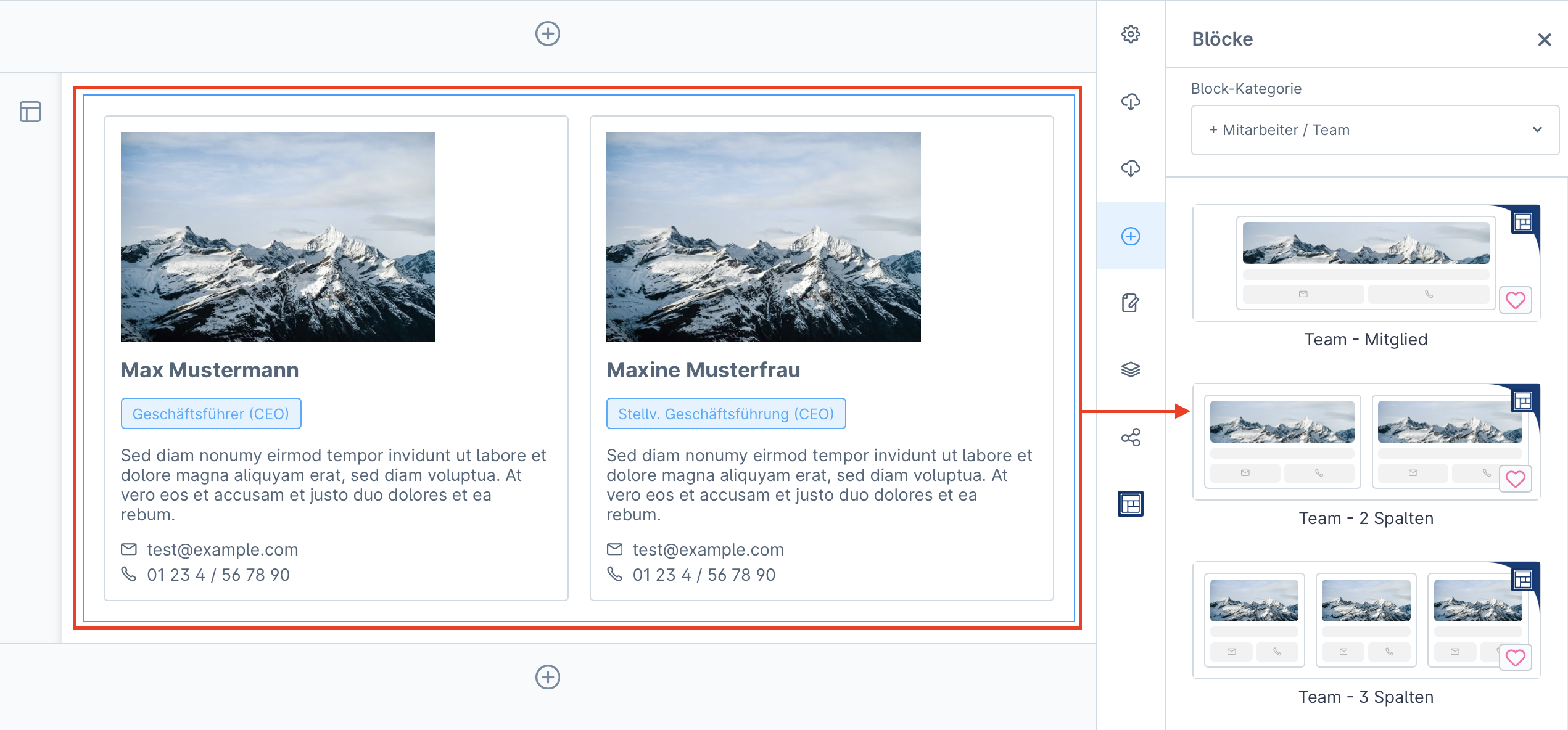 Nutze das **Team - Mitglieder**-Element, um deinem Unternehmen ein persönlicheres Gesicht zu geben und den Besuchern Vertrauen durch die Vorstellung deiner Teammitglieder zu vermitteln.