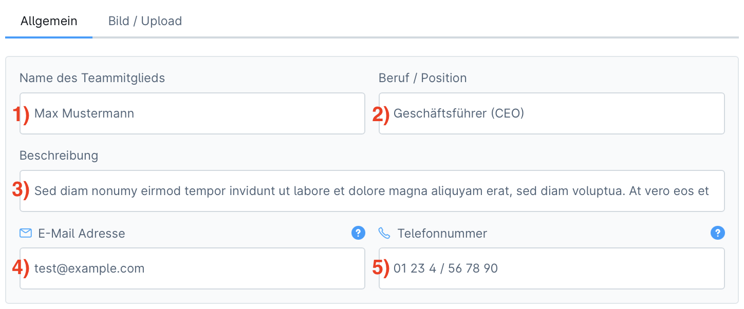<table><thead><tr><th width="255">Funktion</th><th>Beschreibung</th></tr></thead><tbody><tr><td>Name (1)</td><td>Hier kannst du den Namen des Teammitglieds setzen</td></tr><tr><td>Beruf / Position (2)</td><td>Hier kannst du die Position des Teammitglieds in deinem Unternehmen setzen</td></tr><tr><td>Beschreibung (3)</td><td>Hier kannst du die Beschreibung des Teammitglieds setzen</td></tr><tr><td>E-Mail (4)</td><td>Setze hier die E-Mail Adresse des Teammitglieds</td></tr><tr><td>Telefon (5)</td><td>Setze hier die Telefonnummer des Teammitglieds</td></tr></tbody></table>