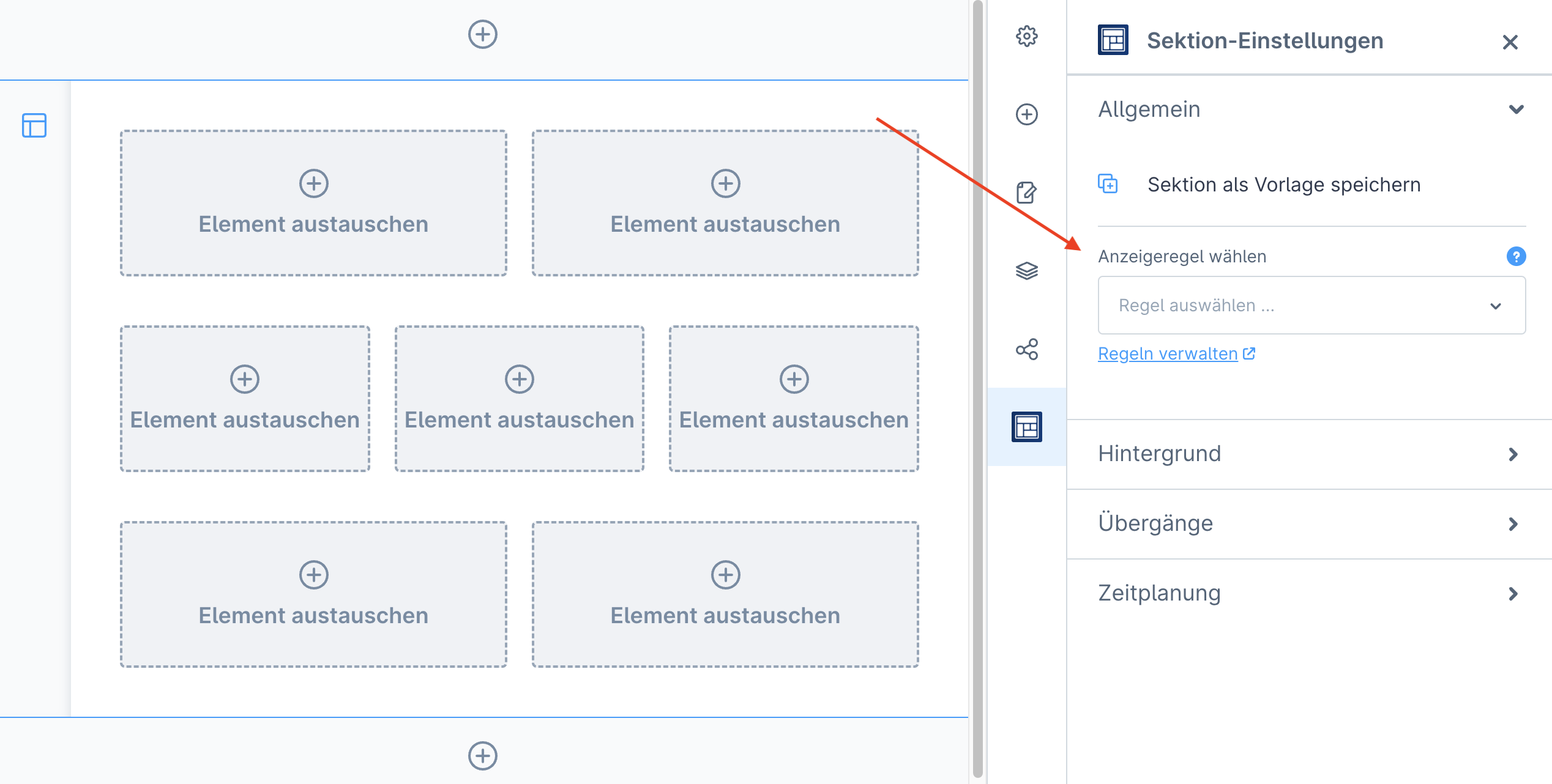 Navigiere zu den erweiterten Einstellungen der Blöcke oder Sektionen, für die du die Anzeigeregeln anwenden möchtest. Wähle die zuvor erstellte Regel aus und füge sie dem jeweiligen Block oder der Sektion hinzu.