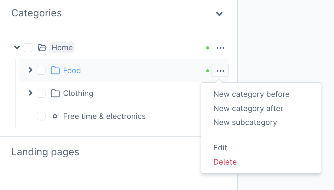 To create a new category, open the 3-dot menu behind an existing category item to use one of the options for adding categories.