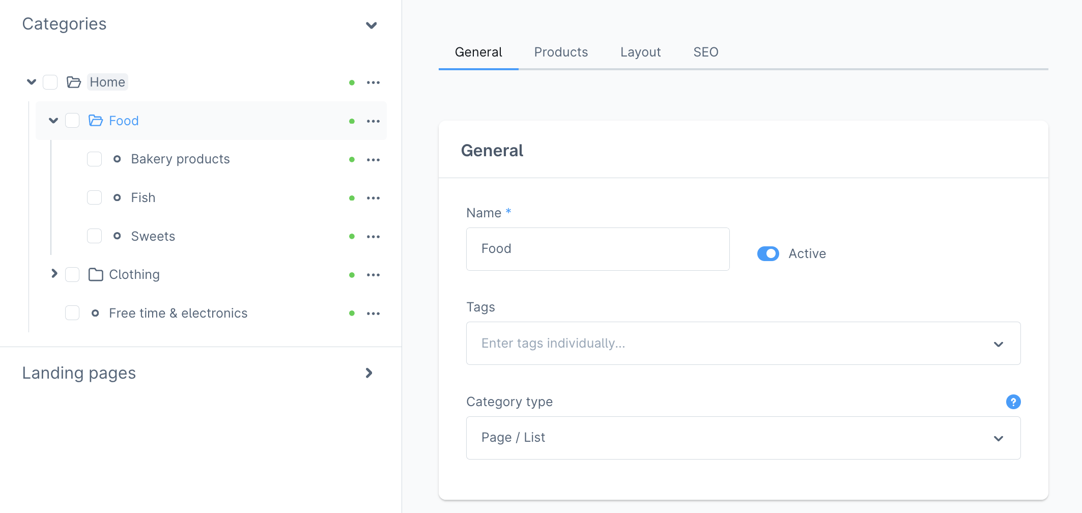 Once you have created your category, you can enter further specifications such as name, description, layout, etc. In the next step, I will explain how to add a layout.